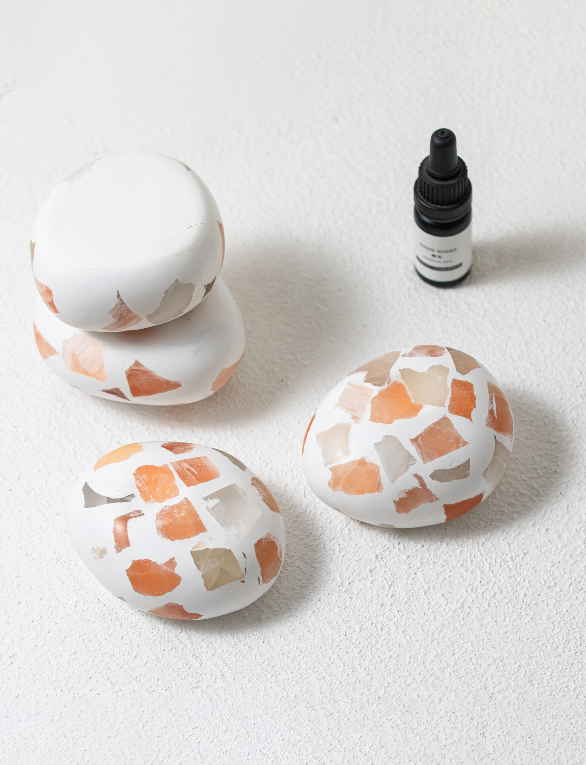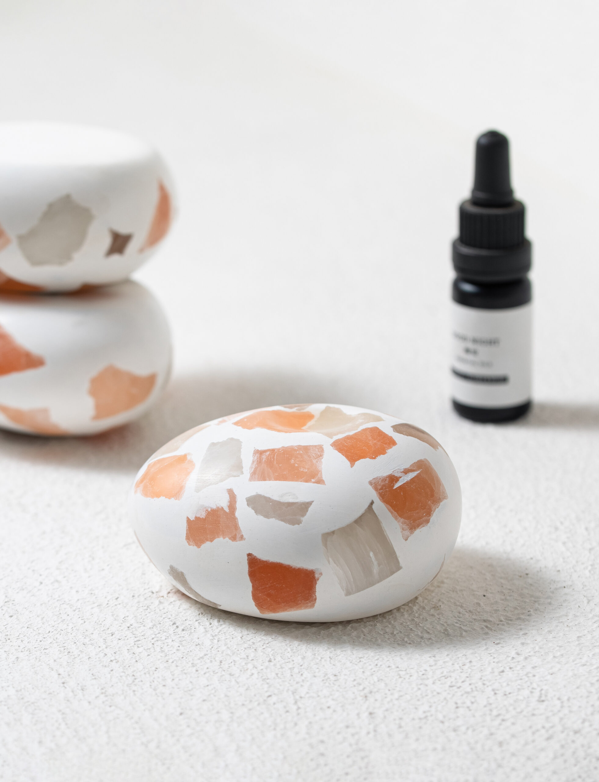Crafted by embedding mineral fragments of varying shapes, colors, and translucency into a plaster base, each piece is uniquely textured and visually rich. A shallow groove holds essential oils, which the porous mineral and plaster surfaces naturally absorb and slowly release. Like a pebble quietly breathing in dew, the stone gently diffuses fragrance into the surrounding air over time.