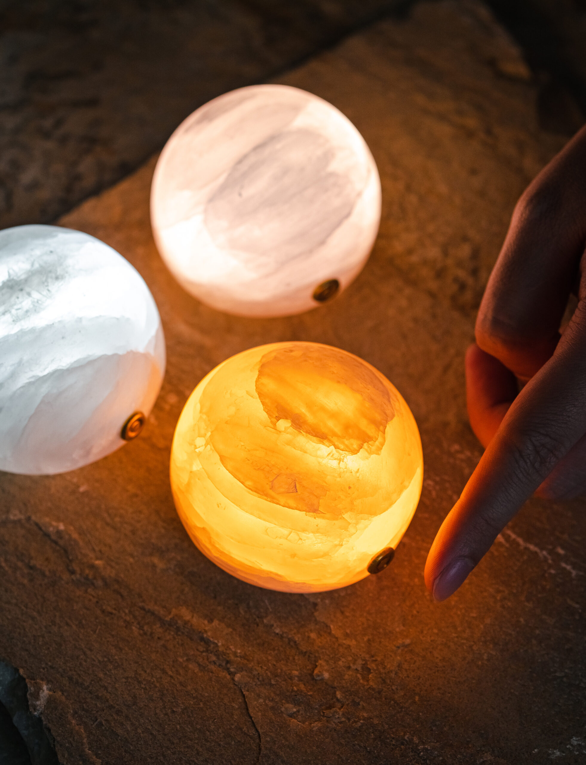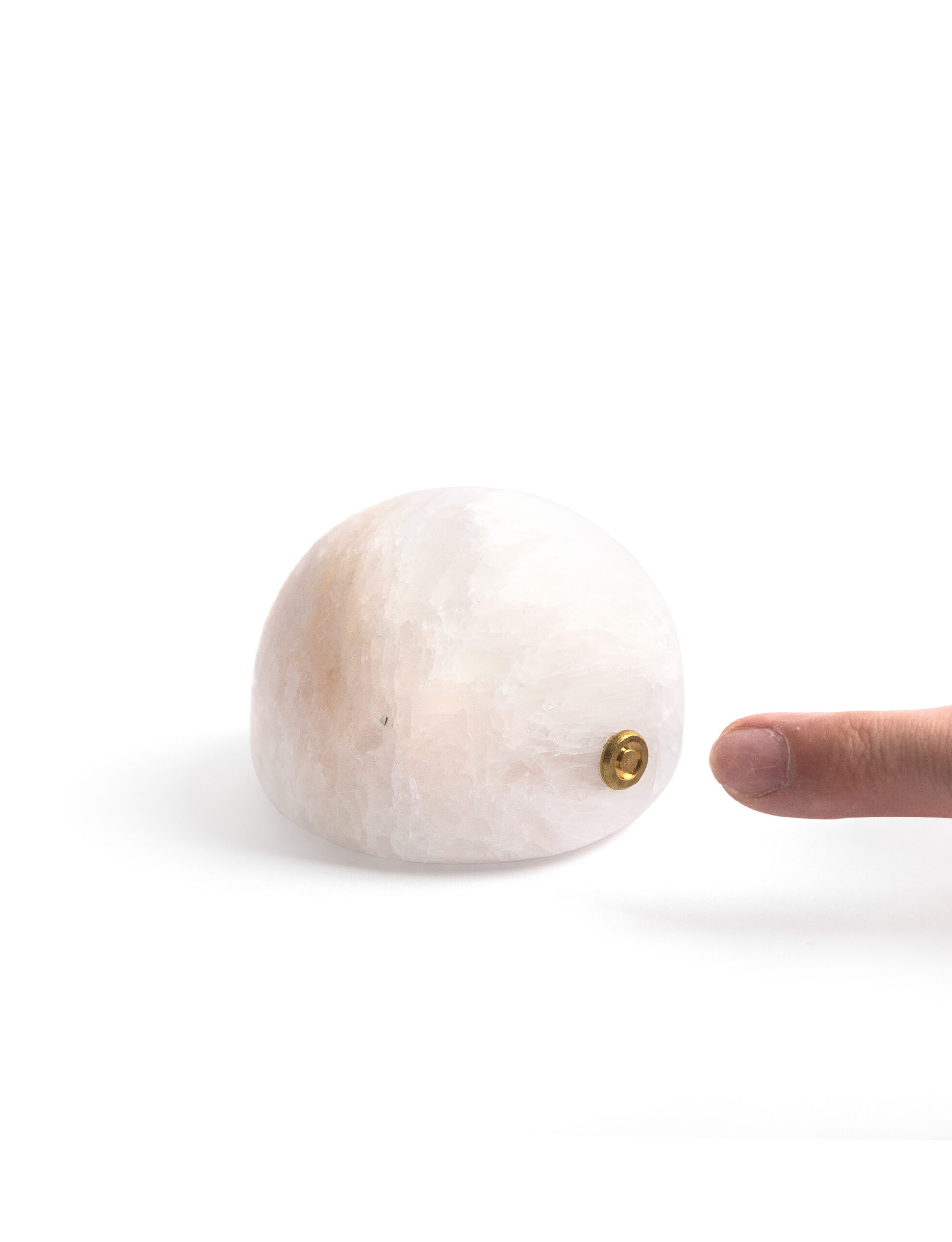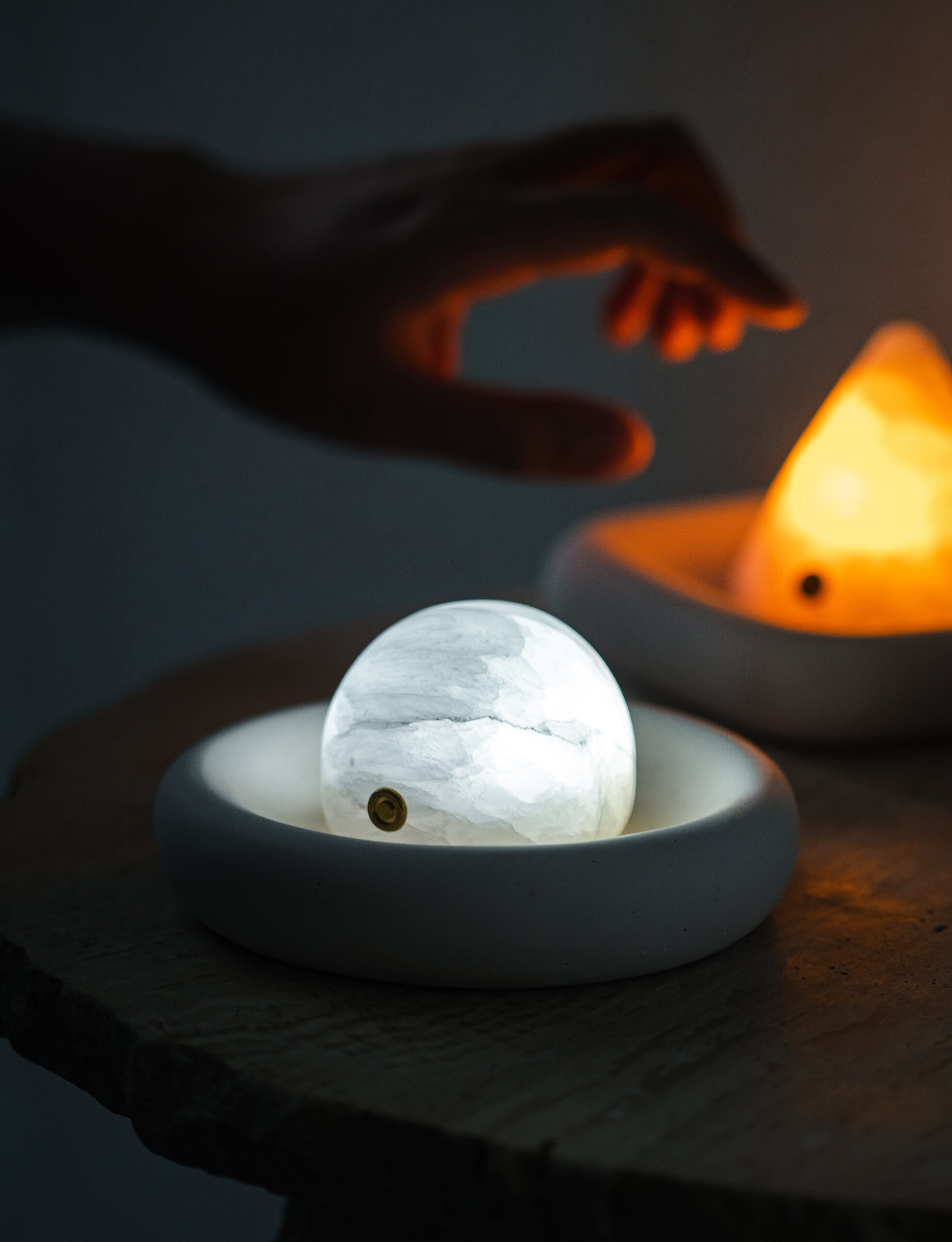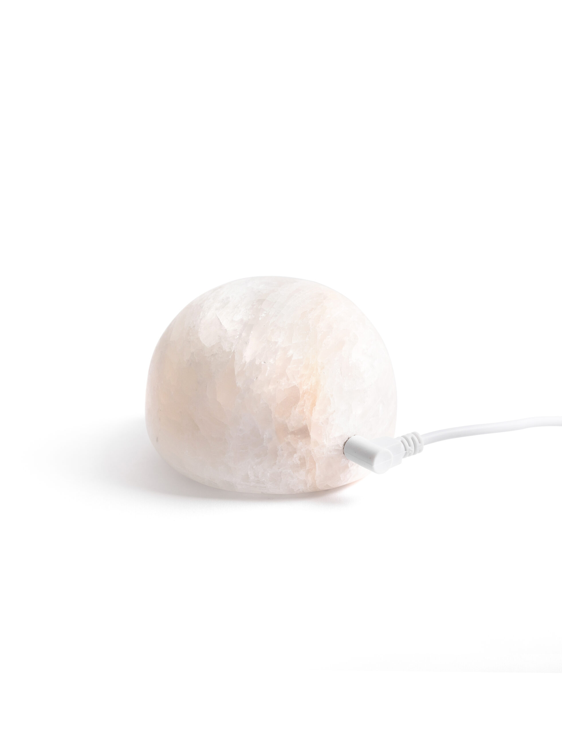Each lamp is sculpted from a piece of natural mineral stone, carefully polished to a rounded, full-bodied form. The semi-translucent surface glows with a soft, misty sheen, while subtle variations in color and veining reflect nature’s quiet artistry.